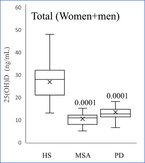 HS 26.85 +/- 7.62Readers who have read lots of research articles probably gasp at these figures. Here is a supposedly incurable disease (MSA, PD too) in which sufferers average 60.8% lower circulating 25-hydroxyvitamin D than age-matched controls.